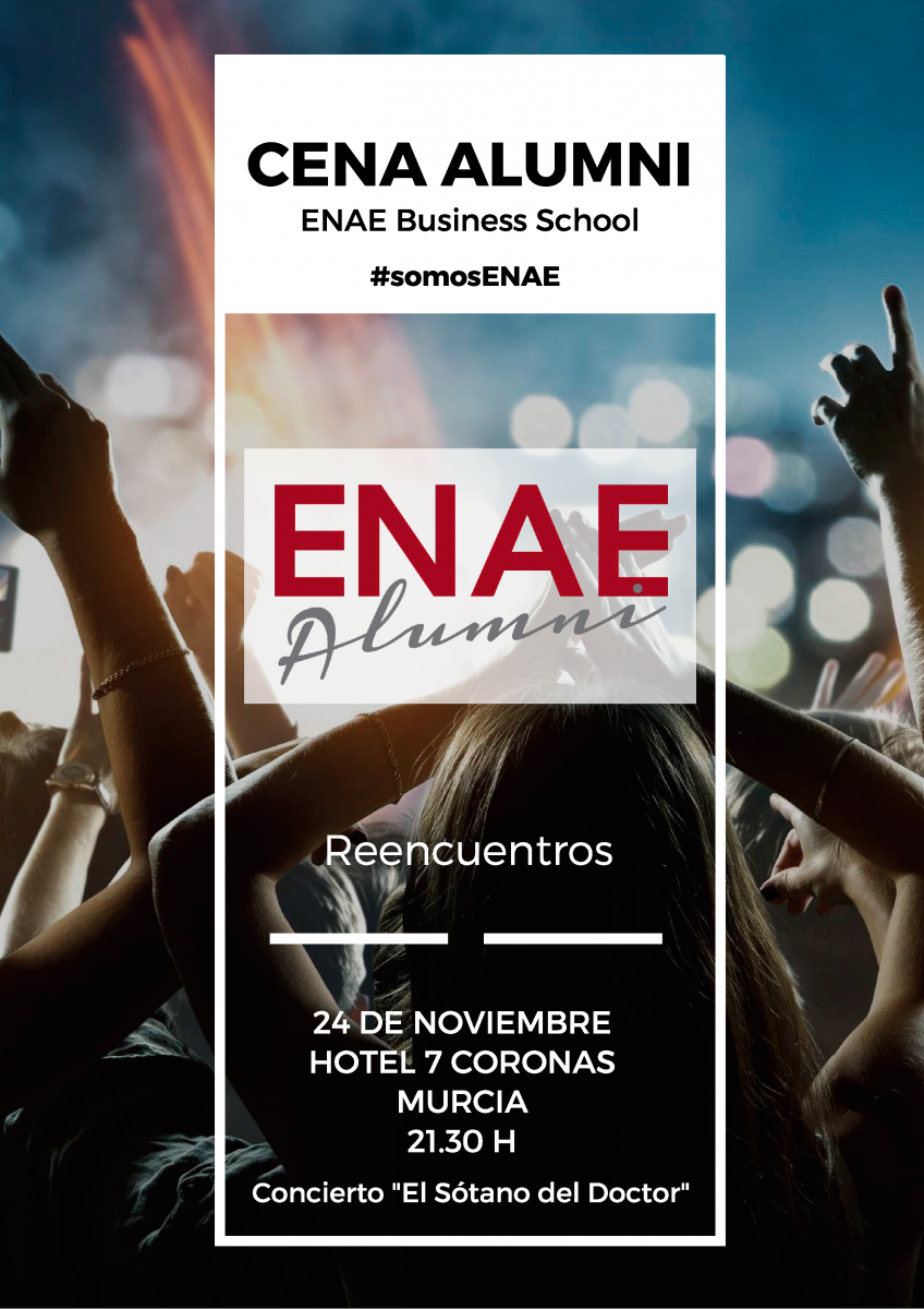 ENAE Alumni, con su Presidente José Ángel Pardo, Director General de Liwe Española S.A. y Manuel Rincón, Decano de ENAE Business School, celebrará la cena anual con un cambio radical en su formato. Este año los asisitentes disfrutarán de una cena tipo cóctel, acompañada de "El Sótano del Doctor” en concierto, con el objetivo de compartir momentos, experiencias, networking y recuerdos entre los antiguos alumnos, nuevos alumnos que acaban de comenzar sus programas máster en ENAE y personas vinculadas e interesadas en la Escuela de Negocios de Murcia ENAE Business School.