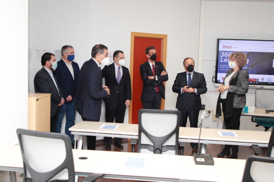 Acompañados por D. Antonio Ballester López, Presidente de la Fundación Universidad Empresa, D. Miguel López González de León, Director General de ENAE Business School y D. Francisco Provencio, Presidente de ENAE Alumni, recorrieron las distintas aulas que se han digitalizado y que permiten la convivencia de alumnos presenciales y virtuales, gracias a la incorporación de sistemas tecnológicos de gran calidad que posibilitan la formación online en directo a tiempo real y la formación semipresencial.