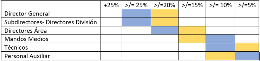 Los porcentajes posibles a retribuir para cada uno de los niveles organizacionales están dentro de los usados habitualmente en estudios de mercado para todo el país. Es decir, entre 20% y 25% sobre su salario fijo, para personal directivo, entre 10% y 15% para mandos intermedios y entre 5% y 10% para el resto de la plantilla.