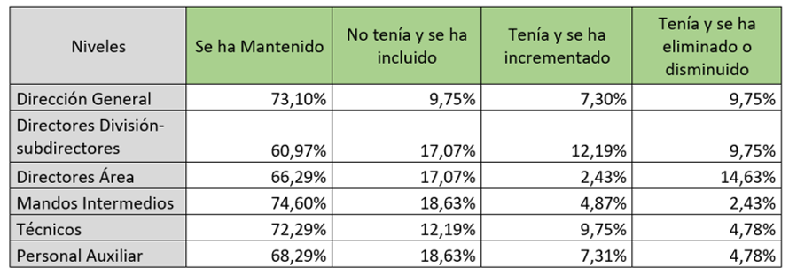 Hemos señalado en color azul claro el porcentaje de retribución variable más usual para cada nivel y en gris la segunda respuesta más común dentro de un escalado de variables posibles a percibir, con el siguiente resultado: