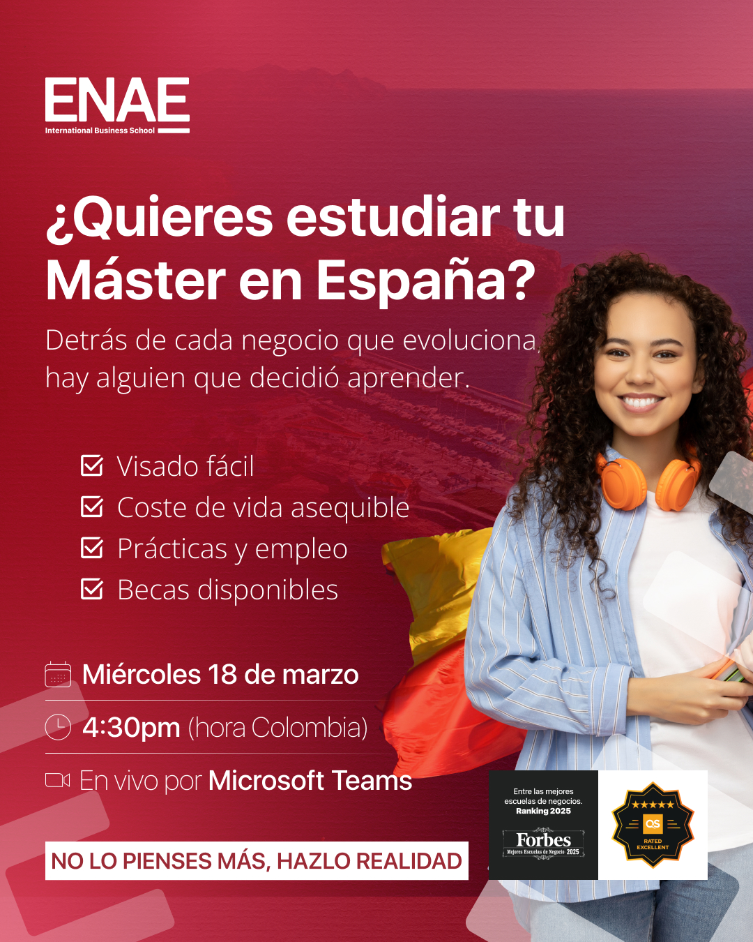 Durante este webinar conocerás cómo estudiar un máster en España, las oportunidades académicas y profesionales que ofrece ENAE y las ventajas de formarte en una escuela de negocios con proyección internacional.