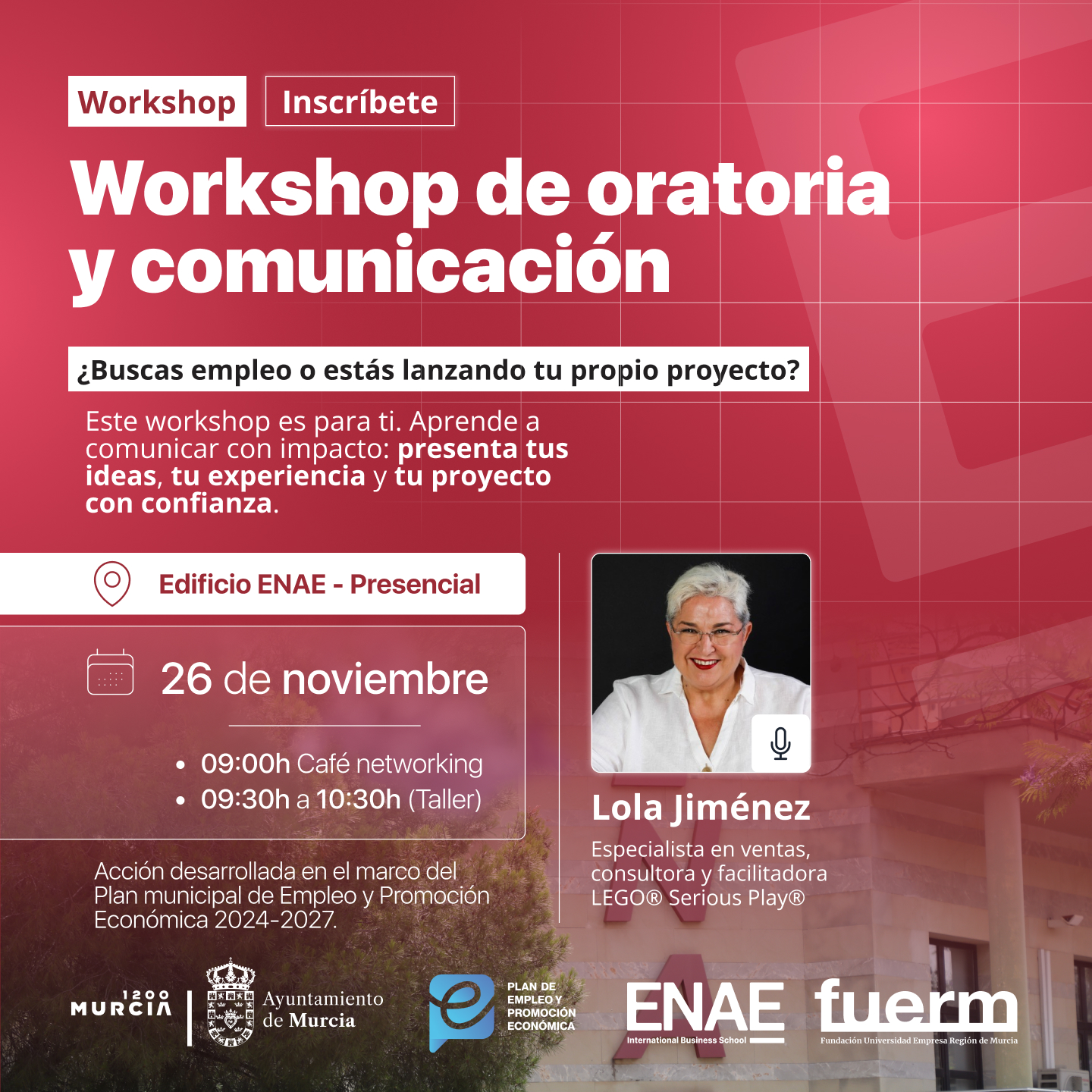 En el marco del convenio de colaboración entre el Ayuntamiento de Murcia y ENAE Business School, dentro del Plan de Empleo y Promoción Económica del Municipio de Murcia 2024-2027, llega un nuevo workshop gratuito de oratoria y comunicación, pensado para quienes quieren mejorar su manera de expresarse y destacar en su entorno profesional.