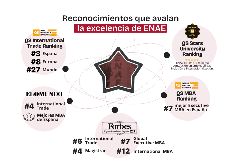 El QS International Trade Ranking evalúa los mejores programas de MBA y másteres especializados en comercio internacional a nivel global. En su última edición, el Master in International Trade de ENAE ha sido clasificado como: 3.º mejor máster de España, 8.º en Europa y 27.º a nivel mundial.